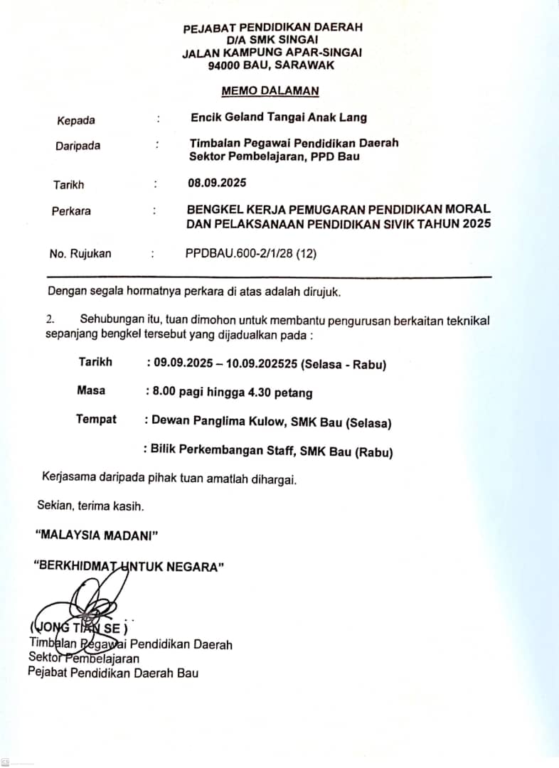 16. MAJLIS PELANCARAN DAN TAKLIMAT PROGRAM PEMENTORAN PEJABAT PENDIDIKAN DAERAH BAU TAHUN 2025 09-09-2025 13:30 BILIK MESYUARAT UTAMA, SMK SINGAI