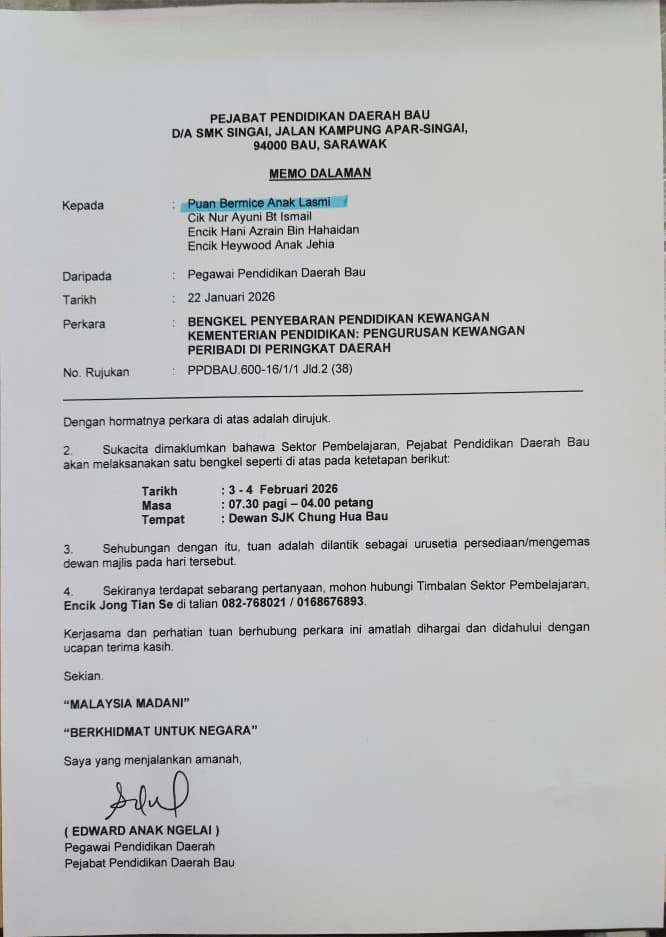 2. URUSETIA PERSEDIAAN/MENGEMAS DEWAN - BENGKEL PENYEBARAN PENDIDIKAN KEWANGAN KEMENTERIAN PENDIDIKAN: PENGURUSAN KEWANGAN PERIBADI DI PERINGKAT DAERAH 03-02-2026